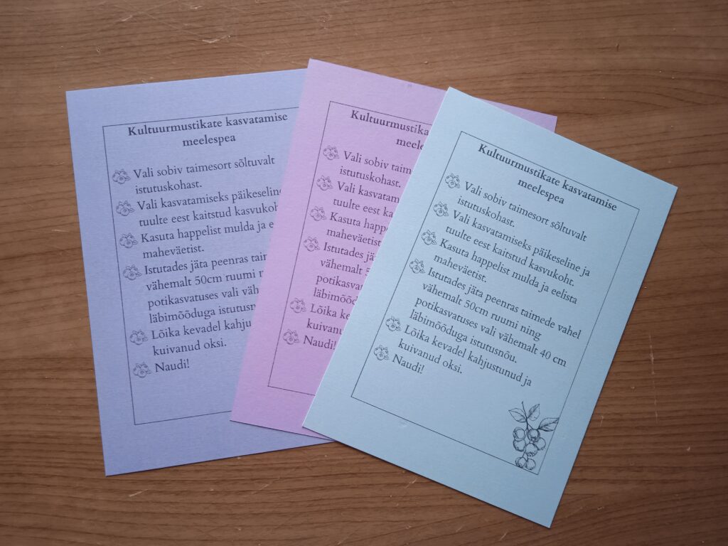 Koolitusmaterjalidena koostasin kompaktse kultuurmustikate kasutamise meelespea, kus iga õppija saab soovi korral põhitõed meelde tuletada ning katsetada. Tagasisidest sain aimu, et materjal võeti hästi vastu : )